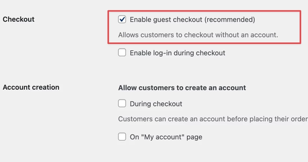 Raney Day Design web developer Luc gives this tip straight up: turn off “guest checkout.” Even though WooCommerce lists it as “recommended,” it actually makes it super easy for scammers to run card testing attacks. By requiring customers to create an account, you add an extra layer of protection and make it a lot harder for hackers to test stolen cards without being noticed.